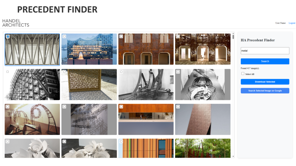 Precedent Finder is an Instagram-style feed for architectural precedents, allowing designers to browse, search, and visually explore reference images across typologies, materials, and styles.