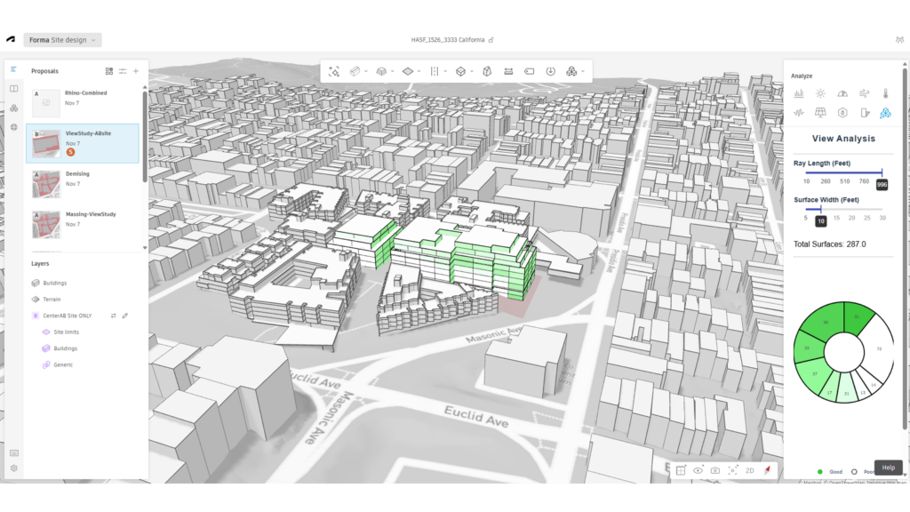 View Study performs openness analysis using the Forma SDK, Python, and Rhino APIs, visualizing surrounding building obstructions as white overlays and expressing unobstructed areas through a green gradient.